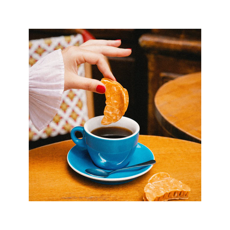 Une pince à cheveux en forme de croissant gourmand qui nous rappelle ceux de notre enfance, qu’on dégustait encore tièdes, et qui nous laissaient les doigts pleins de beurre. Un souvenir régressif à emporter avec nous tous les matins !