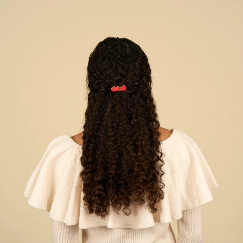 Une jolie barrette décorée de trois petites pommes rouges. On craque pour cet accessoire fruit de saison que l’on clippe à nos tresses, col de chemise ou mèches indisciplinées.