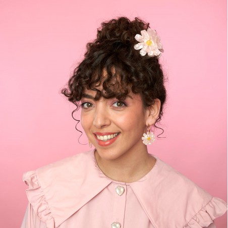 Une nouvelle fleur a poussé dans le jardin de Coucou Suzette ! Un sublime cosmos rose pâle nacré aux détails dorés et au pistil jaune clair qui attends patiemment d’être butiné. Hyper pratique, cette magnifique fleur fait le bonheur de toutes les chevelures.