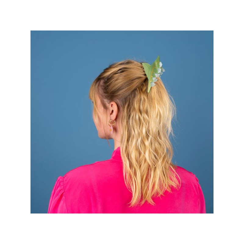 Une jolie grappe de muguet pour rafraîchir notre look du jour ! On raffole de cette pince à cheveux fleurie pour sa forme originale et l'élégance de son feuillage, de ses petites clochettes bleutées et de ses jolis détails dorés pour un air un peu rétro. Le parfait petit bouquet pour finaliser son outfit !