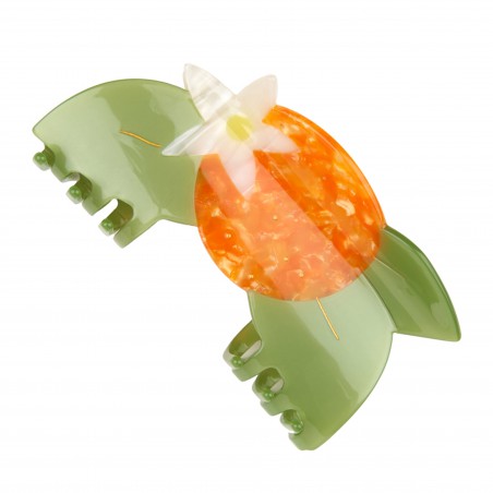 En voilà une qui va faire le bonheur des z’imposantes chevelures : la pince à cheveux fleur d’oranger ! Avec ses larges feuilles et son orange en fleur, elle agrippe les crinières longues et épaisses comme personne. Un accessoire original qui invite Mère Natchure dans toutes nos coiffures.