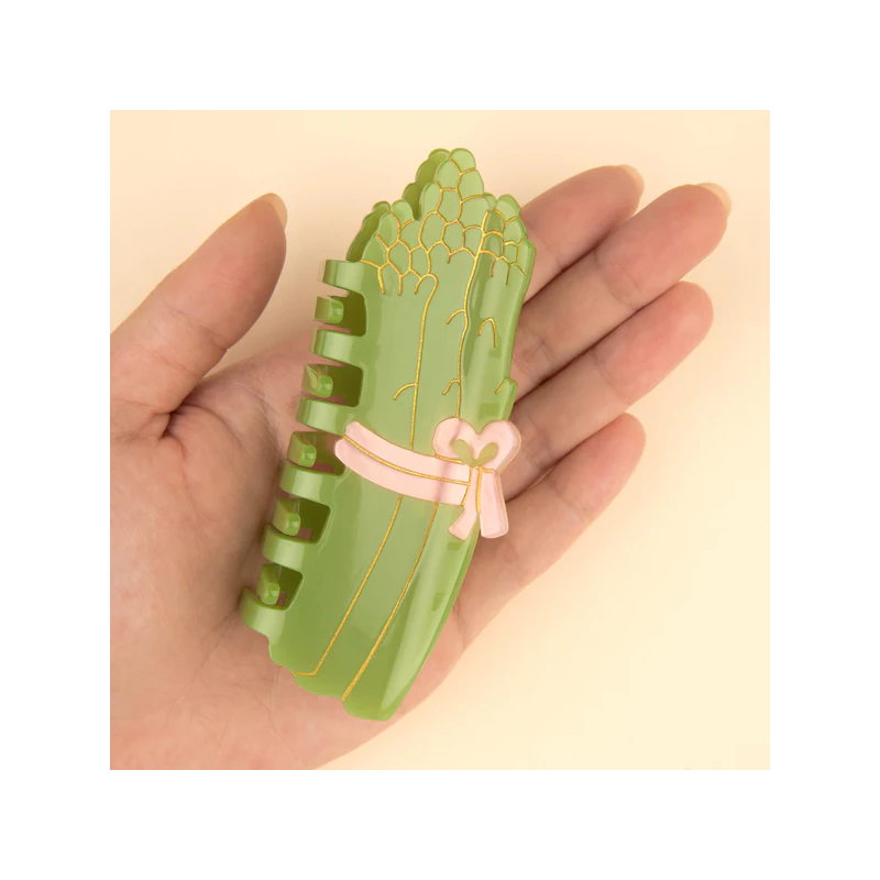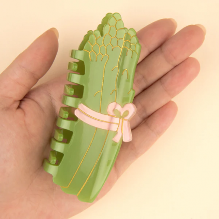 Pour aller faire son marché du dimanche ou s’occuper de son potager, on opte pour la pince à cheveux asperge ! Trois petites choupettes liées d’un beau ruban rose, qui ne demandent qu’à dégager nos minois avec fraîcheur et légèreté. Cet accessoire original maintient parfaitement les chignons bananes et demi-queues pour les cheveux fins comme épais.