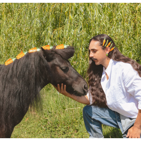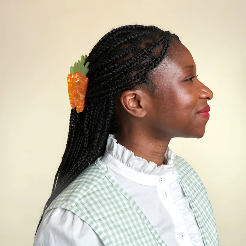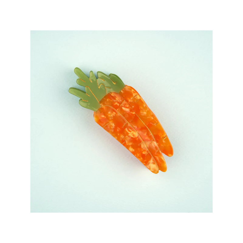 Avis aux amateurs.rices de légumes croquants (ou croquang comme dirait Cyril Lignac), voici une bien belle pince à cheveux en forme de botte de carottes ! Trois jolies carottes bien rangées, feuillage au vent, prêtes à dompter les chignons improvisés. On adore son design graphique et sa couleur orange qui nous hypnotisent de tous ses reflets.