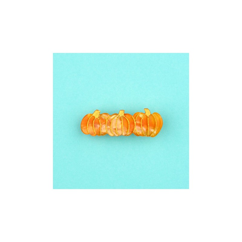 On fond devant ce trio de minis citrouilles blotties les unes contre les autres. Une barrette à cheveux originale aux magnifiques reflets oranges et dorés qui lui donne des allures de petit bijou d’automne. À clipser dans ses coiffures à volonté !