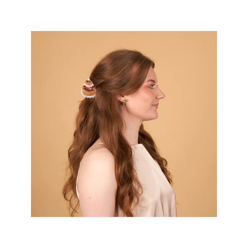 Une pince à cheveux originale en forme de religieuse, cette divine petite pâtisserie tout en choux et en crème, qui nous fait directement retomber en enfance. On clipse cet accessoire gourmand effet nacré à nos chignons, pour une coiffure originale, romantique, et délicieusement régressive. Elle est tout aussi adorable sur l’anse de nos sacs qu’elle décore à merveille.