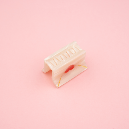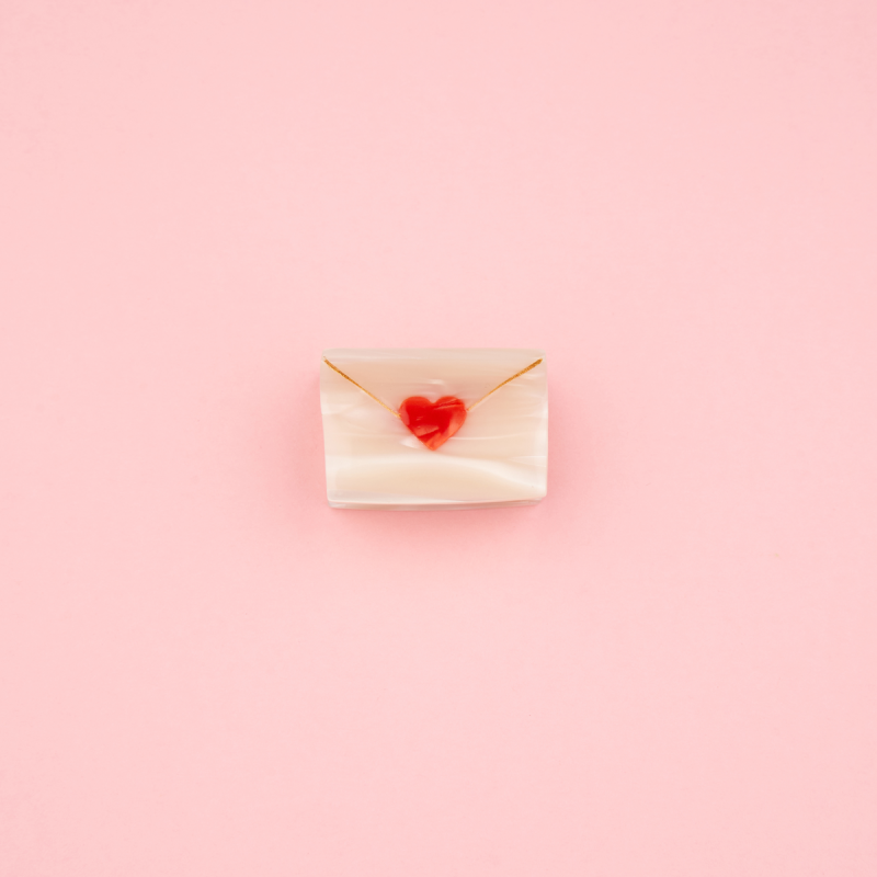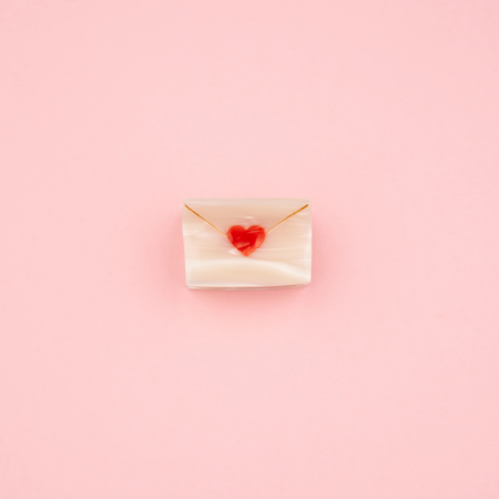 Le courrier est arrivé ! Et parmi les lettres, cette petite enveloppe nacrée scellée d’un cœur rouge… Allons bon, quel prétendant.e a encore frappé ? En attendant de lire ses déclas z’enflammées, on porte cette mini pince à cheveux avec nos plus belles demi-queues.
