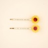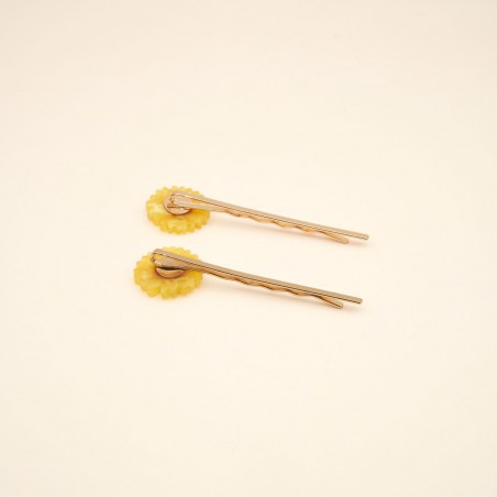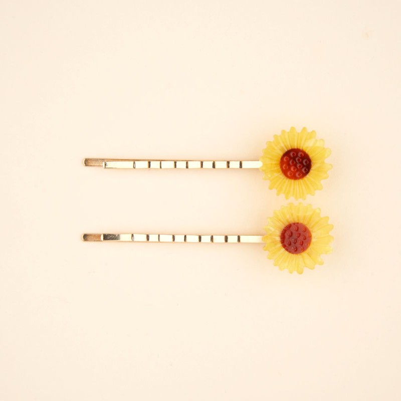 Pour changer des barrettes crocodile, on choisit ce duo de barrettes fines dorées et décorées de notre tournesol fétiche. Un accessoire fleuri qui maintient les mèches comme personne et qu’on adore garder tout le temps sur soi.