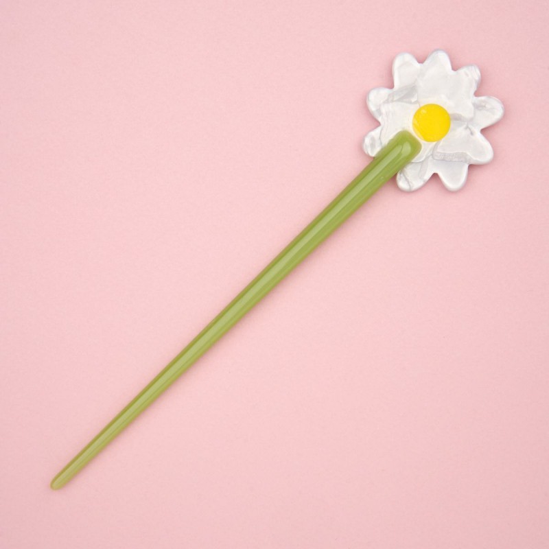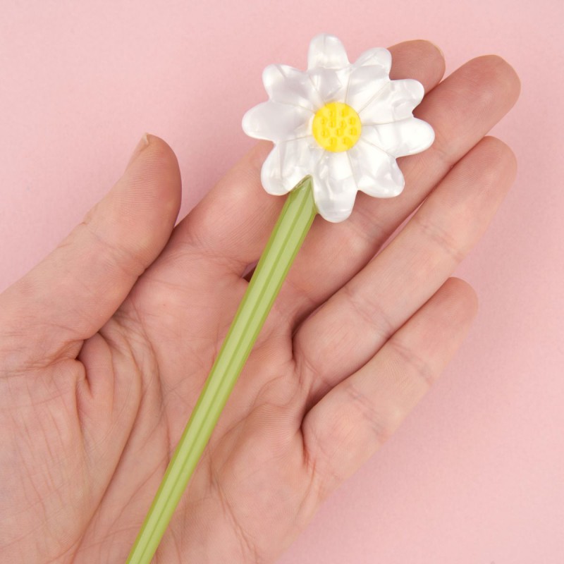 Finito les stylos dans les chignons, place au pic fleuri ! Un accessoire cheveux original façon pâquerette tout juste cueillie dans le jardin. Une fleur qui nous donne bien belle allure en toute circonstance.