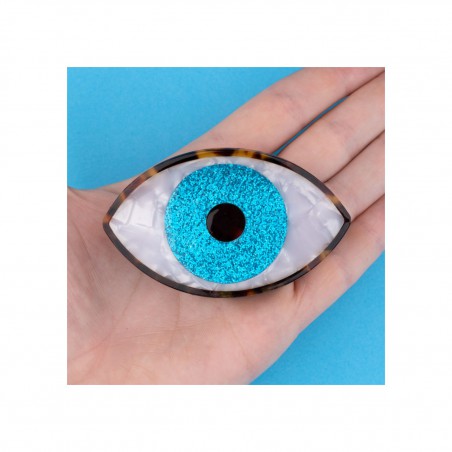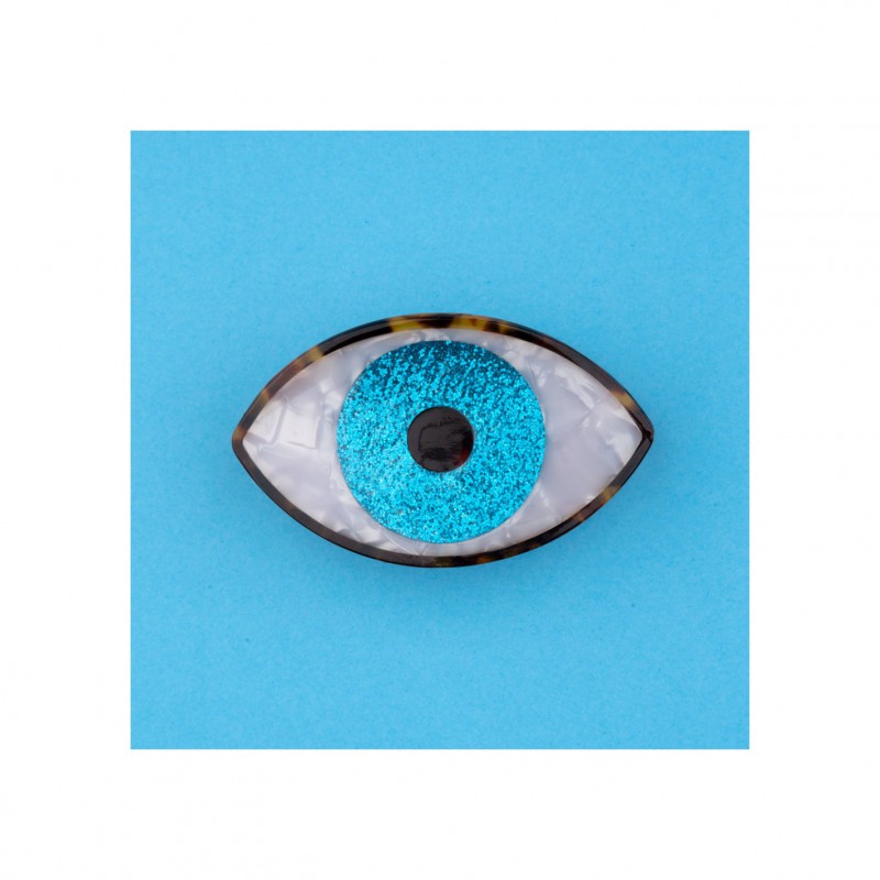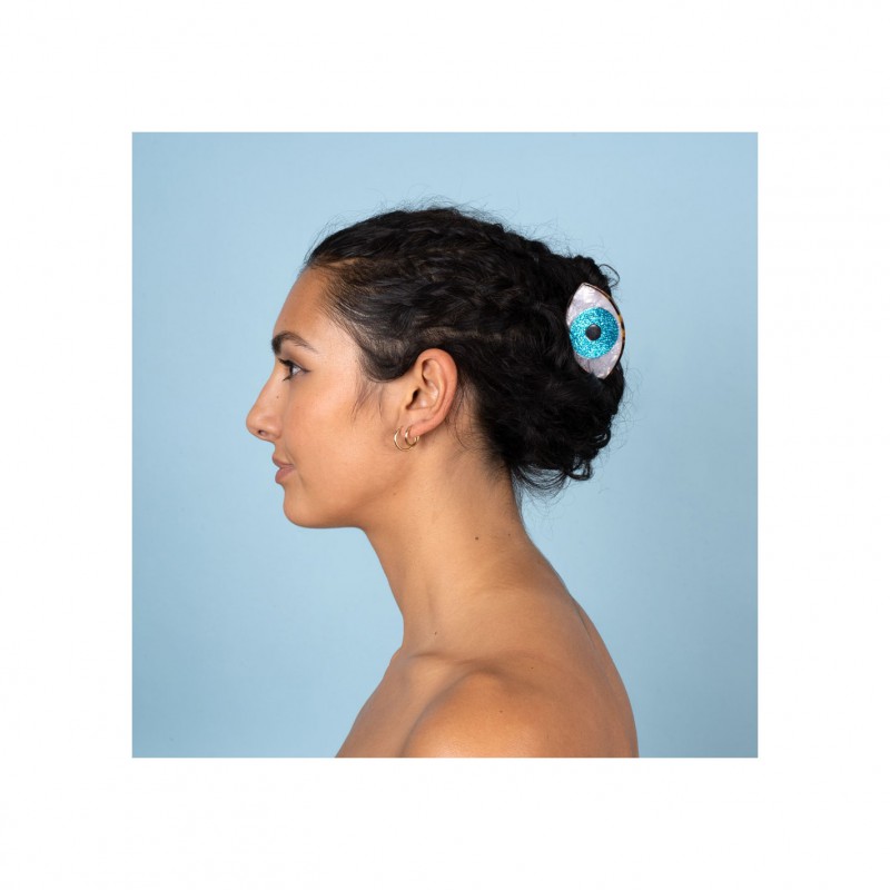 Ohlala mais que voilà… Notre iconique pince à cheveux Oeil bleu, désormais en version pailletée ! On raffole de cet iris hypnotisant et scintillant de mille feux qui ne peut que nous porter bonheur, bien logé dans nos cheveux. Un vrai petit bijou nacré qui veillera sur nous en toutes circonstances. Édition limitée !