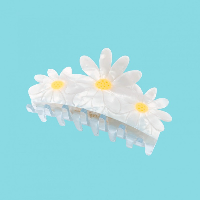 Pince à cheveux fleurie de blanche et jaune faite à partir d'acétate de cellulose.