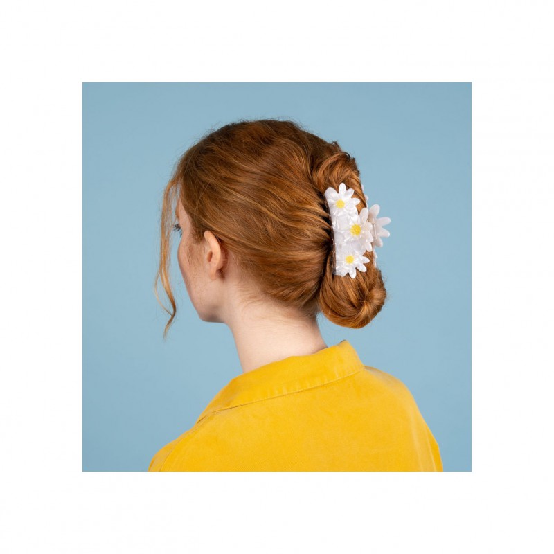 Une grosse pince à cheveux composée de trois jolies pâquerettes nacrées au pistil jaune vif pour sublimer votre chignon.
