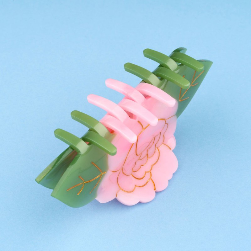 Une pince à cheveux originale en forme de sublime pivoine rose ambiance lait fraise réhaussé de ses délicates feuilles vert amande. Cette belle fleur colorée s’épanouit gaiement dans les chignons et fait le bonheur des toisons XL, longues et/ou bouclées.
