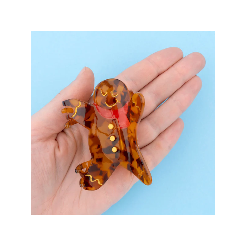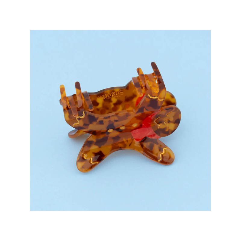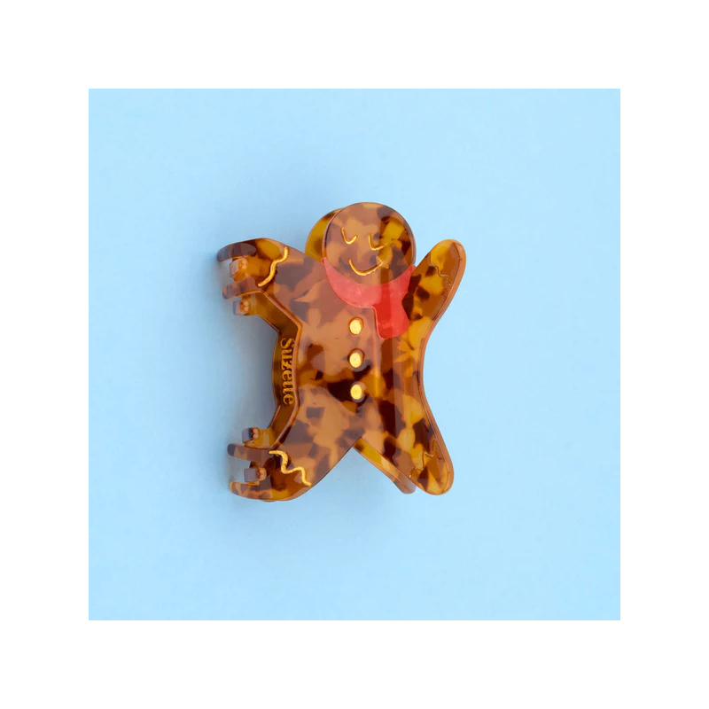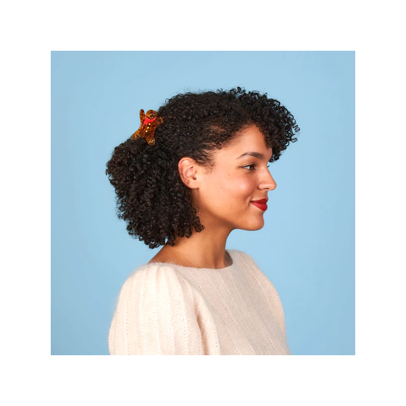 Que serait la période des fêtes sans des gingermen tout chauds sortis du four ? On célèbre ces biscuits de Noël qui nous enivreraient presque de leur douce odeur de cannelle, avec une pince à cheveux assortie, façon écaille de tortue, ornée d’une belle écharpe rouge et de détails dorés qui lui font une bouille à croquer. Au top pour des coiffures festives et cosy tout l’hiver !