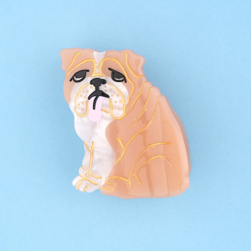 Avec son allure nonchalante, sa langue pendante et son air flemmard, le Bouledogue anglais n’en reste pas moins un toutou très affectueux qui excelle dans l’art de la sieste. Il adore ronfler dans son panier douillet (ou sur le canapé, n’est-ce pas), emmitouflé de ses propres bourrelets. Une pince à cheveux marron et blanche, avec des dents en acétate.