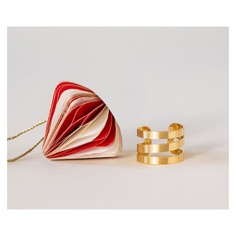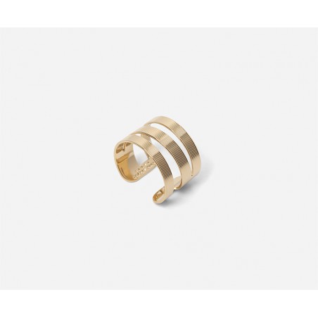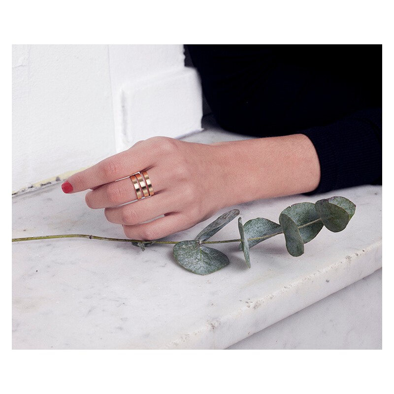 Bague dorée ajustable simple, composée de trois anneaux plats finement gravés.