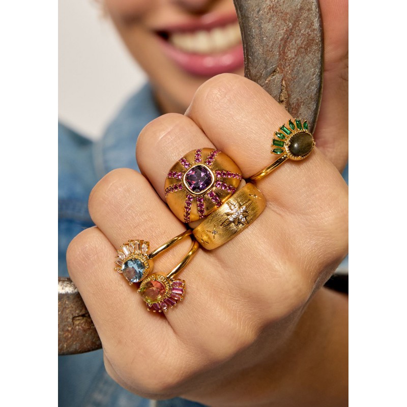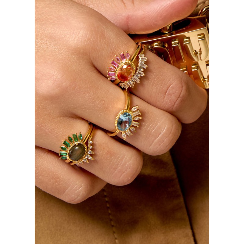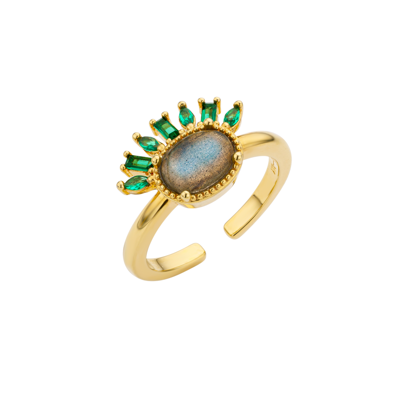 La bague LABRADORITE LADY de MYA—BAY est dorée à l’or fin recyclé 24 carats. Son design s’inspire de la fleur Acca, et sa pierre semi-précieuse en labradorite révèle de subtils reflets irisés selon la lumière. Chaque bague est unique, comme la pierre qu’elle met en valeur. Mixez-la avec les bagues créatives ELISABETH ou DIANA pour jouer sur les contrastes entre reflets irisés et doré texturé. Une combinaison précieuse et unique, comme vous.
