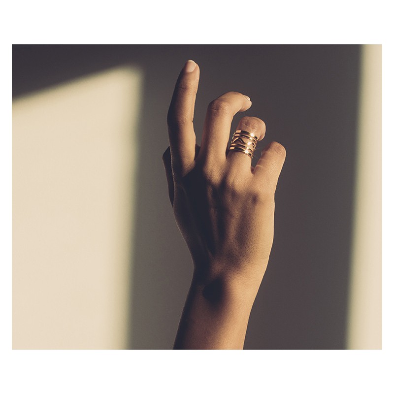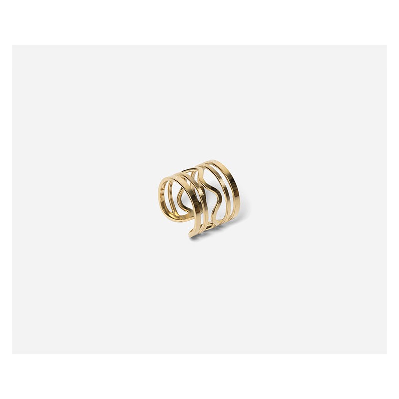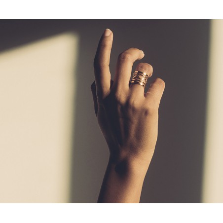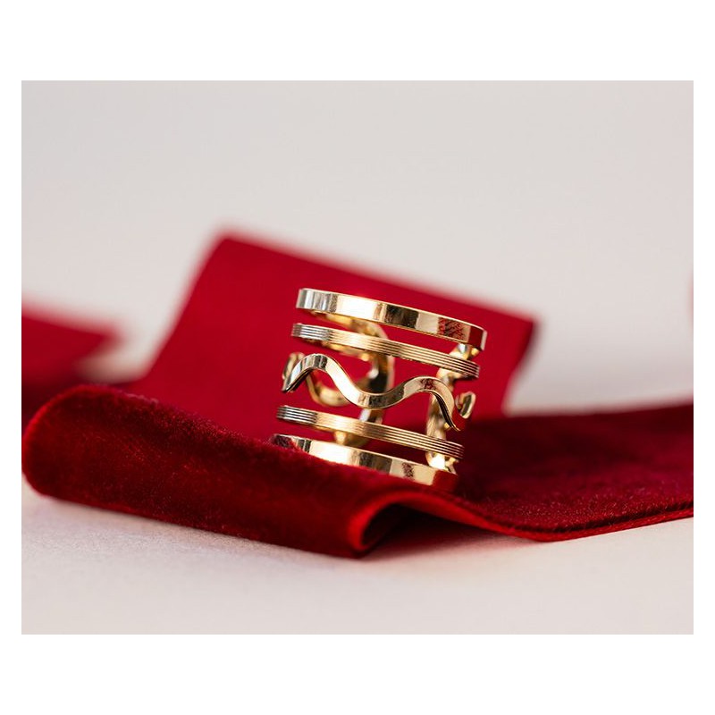 Bague dorée graphique ajustable associant des jeux de lignes droites, ondulées; et gravées