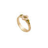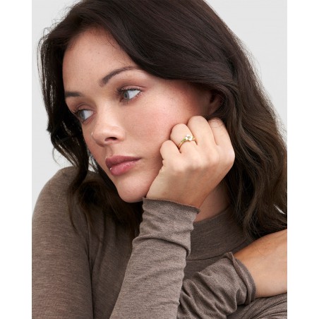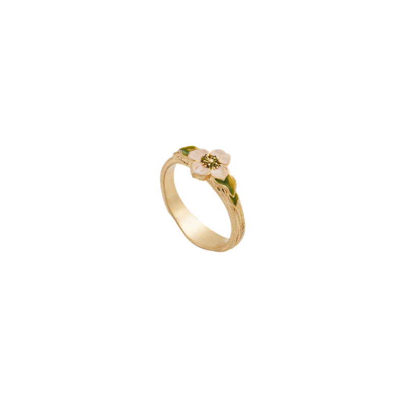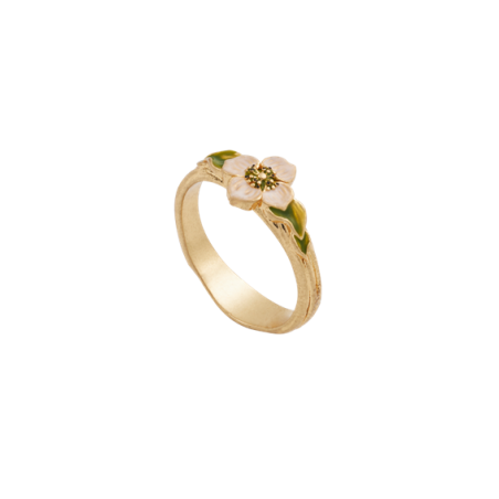 Subtile, discrète mais d'une beauté indéniable, la bague Anémone symbolise le calme de la forêt lorsque les fleurs s'épanouissent en silence. Avec ses pétales blancs peints à la main, nichés entre des feuilles vert olive et sertis sur un anneau doré, cette bague respire le charme et l'élégance.