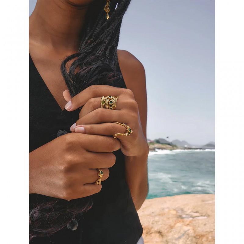 Bague en laiton plaqué or 3 microns d’or 999/1000, émail et pierres semi précieuses.