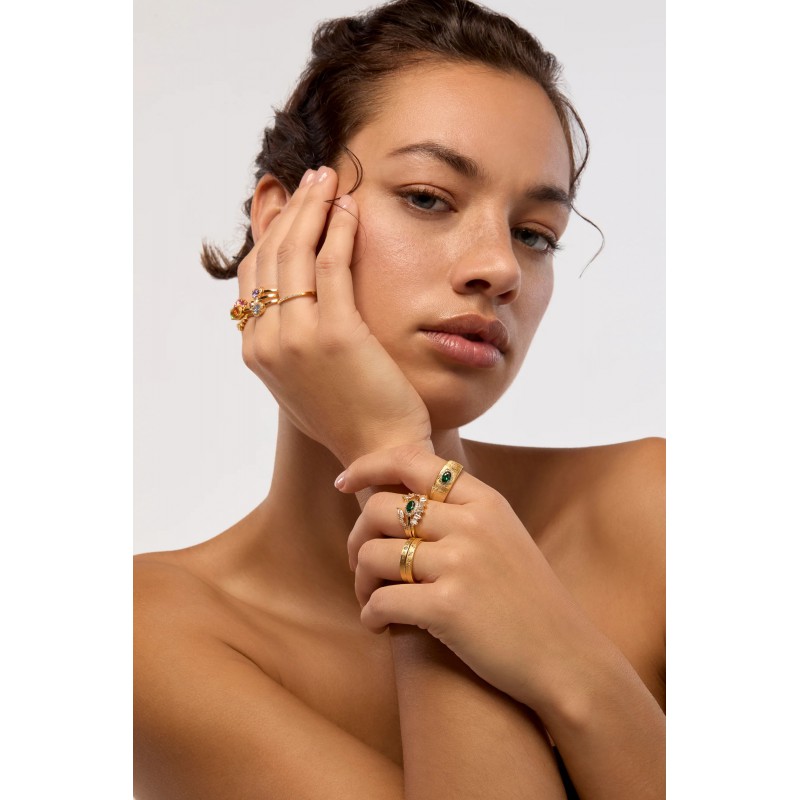 La bague GREEN DYNASTY CUFF de MYA—BAY revisite l’esprit Dynasty avec une touche de couleur fraîche et audacieuse. En or brossé et ajustable, elle est ornée de zircons verts lumineux qui apportent profondeur et modernité à ce design inspiré des bijoux vintage. Une bague forte, idéale pour twister un look avec élégance.