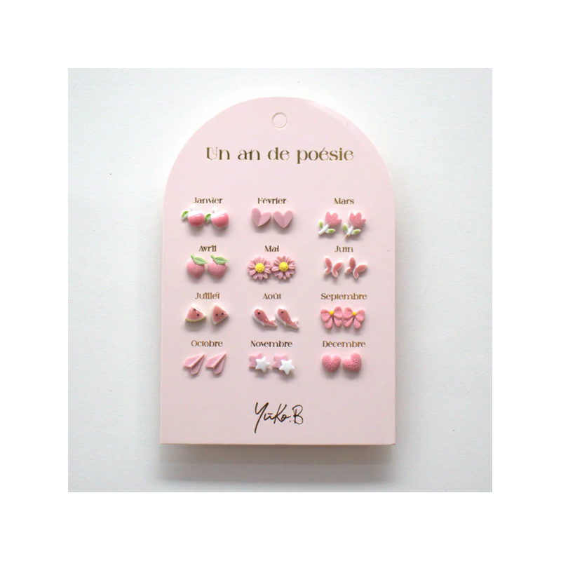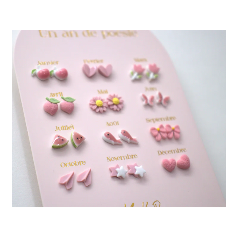 12 paires de boucles d'oreilles en céramique et tige en acier inoxydable dont une paire par mois de l'année. Ces boucles sont garanties sans Nickel.