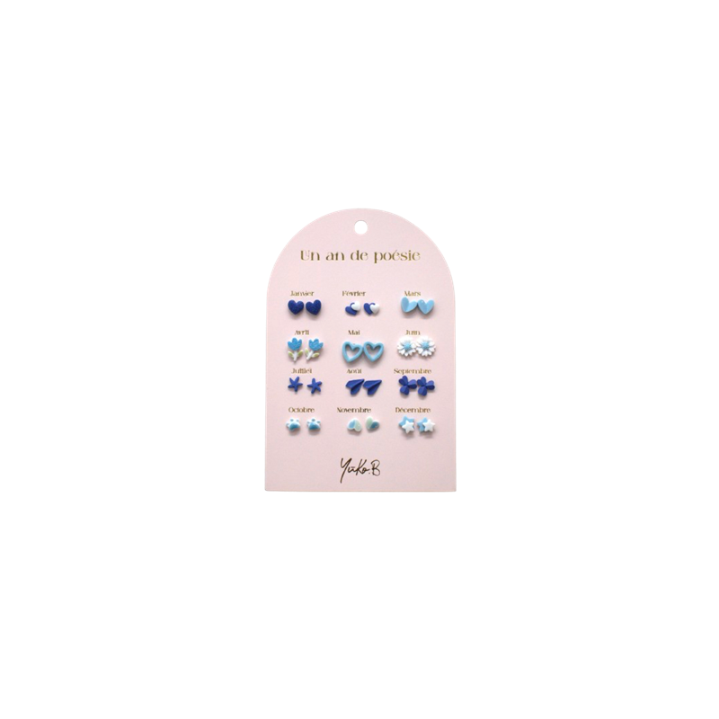12 paires de boucles d'oreilles en céramique et tige en acier inoxydable dont une paire par mois de l'année. Ces boucles sont garanties sans Nickel