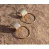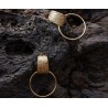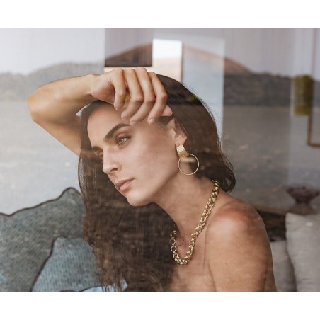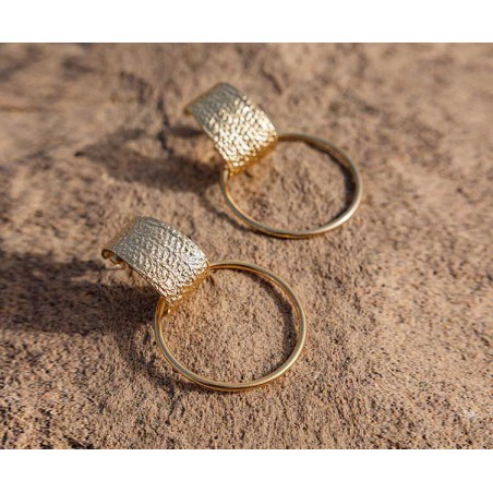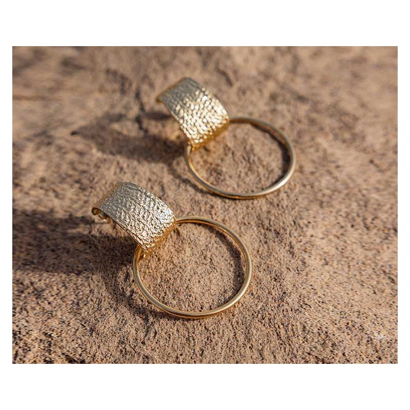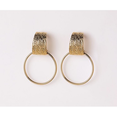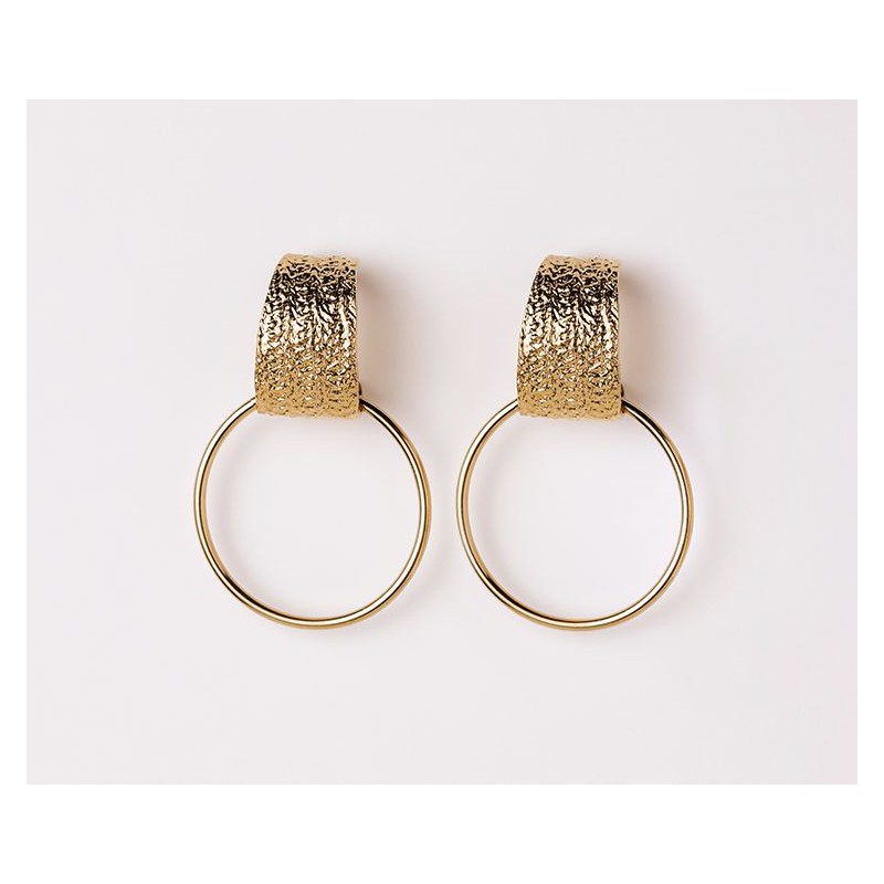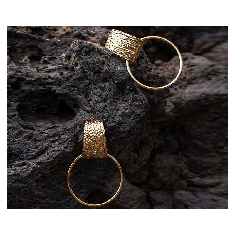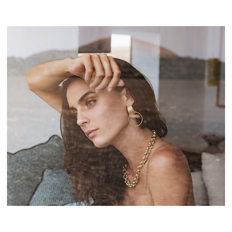 Composées d’une large créole et d’un anneau rond doré, ces boucles d’oreilles se distinguent par leur texture unique et le relief subtil de la partie haute. L’esprit vintage et le mouvement léger de ce modèle en font un bijou à la fois intemporel et original.