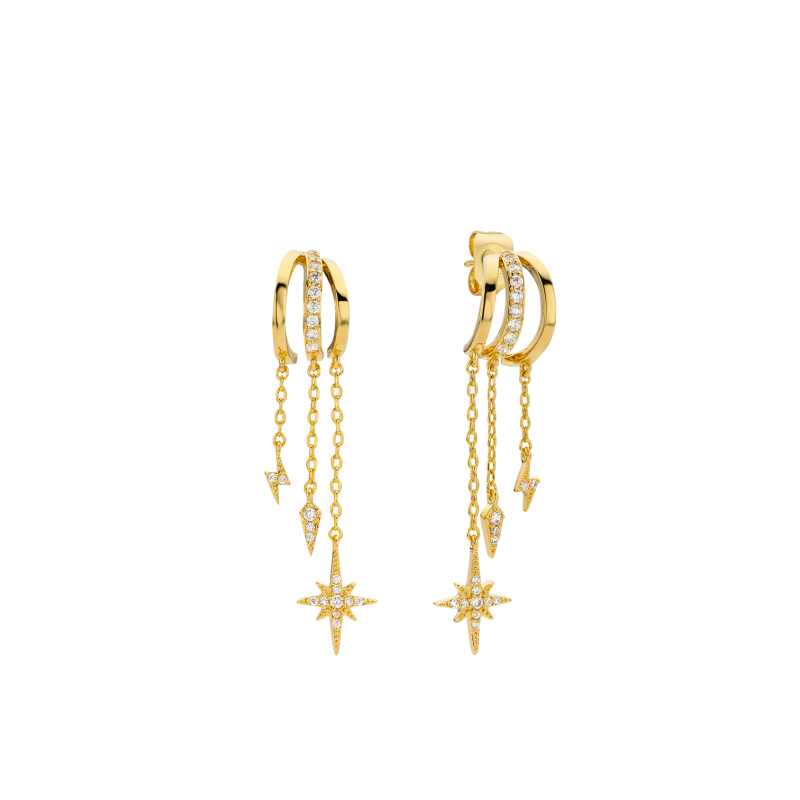 Les boucles d’oreilles DIWALI RIVER de MYA—BAY sont dorées à l’or fin recyclé 24 carats. Elles combinent la finesse des RIVER avec l’icône phare de la marque : l’étoile DIWALI. Elles mesurent 4,3 cm de long et captent la lumière à chaque mouvement. Élégantes et lumineuses, les DIWALI RIVER allient symbolique et féminité, parfaites pour illuminer une tenue de jour comme de soirée. Complétez votre univers lumineux avec la manchette DIWALI CUFF ou la bague DIWALI RING, pour une harmonie scintillante dans la même gamme.