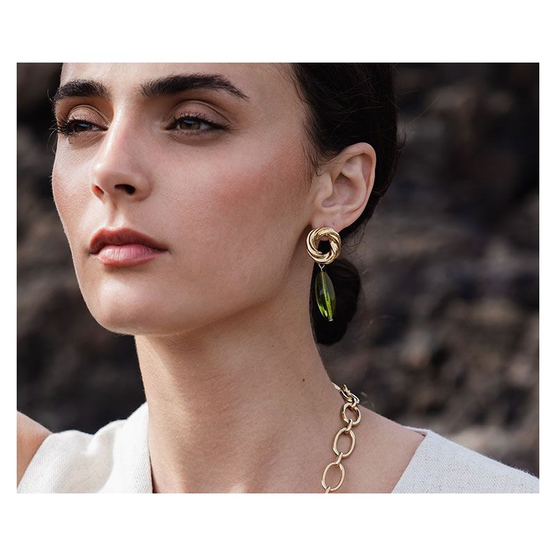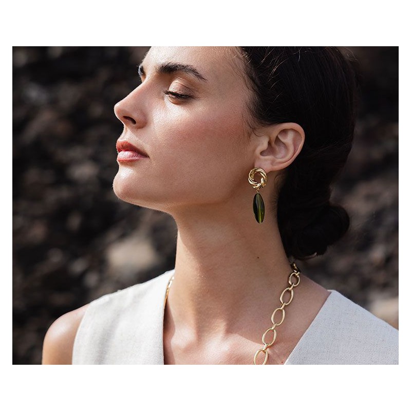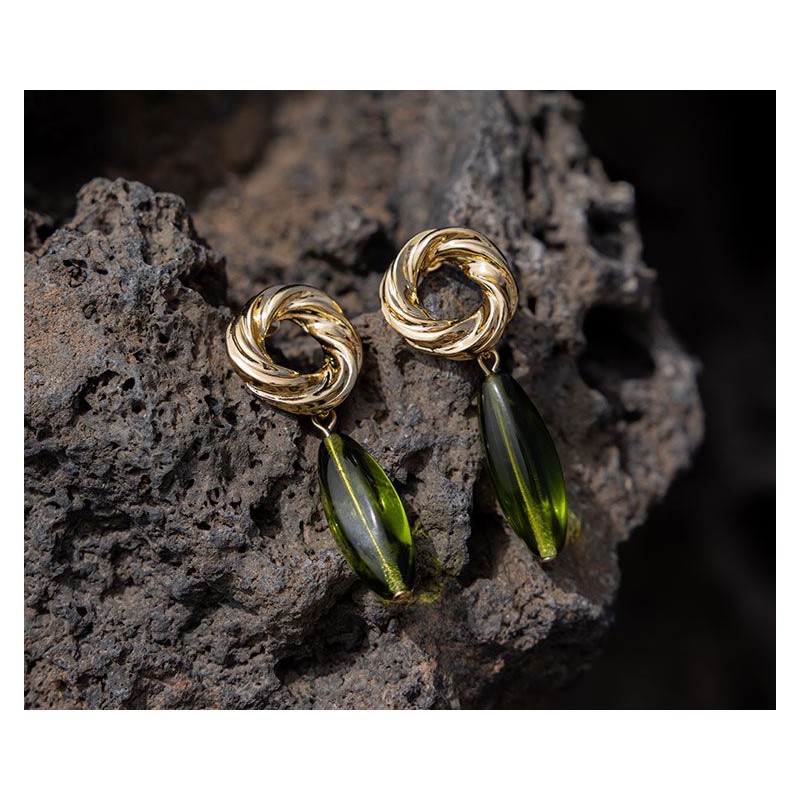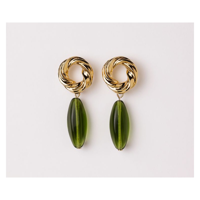 Ces boucles d'oreilles dorées à l'or fin 24 carats sont un mélange parfait d'élégance rétro et de modernité. La partie supérieure se compose d'un rond torsadé brillant, sur laquelle est suspendue une perle en cristal de verre transparent, en forme d'amande allongée ajoute une touche de couleur verte au modèle.
