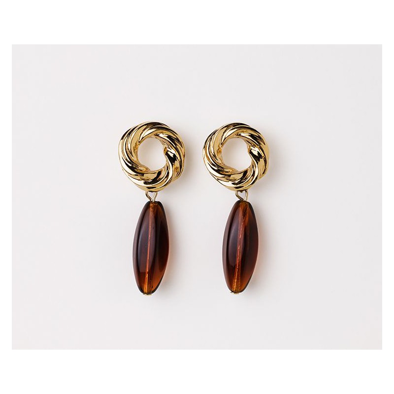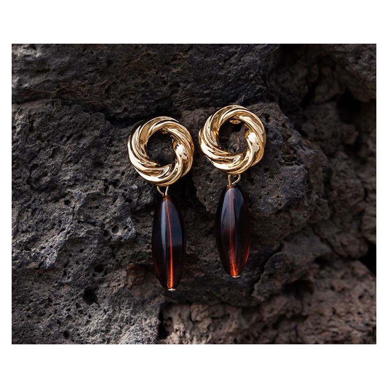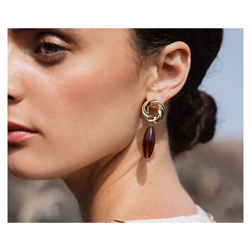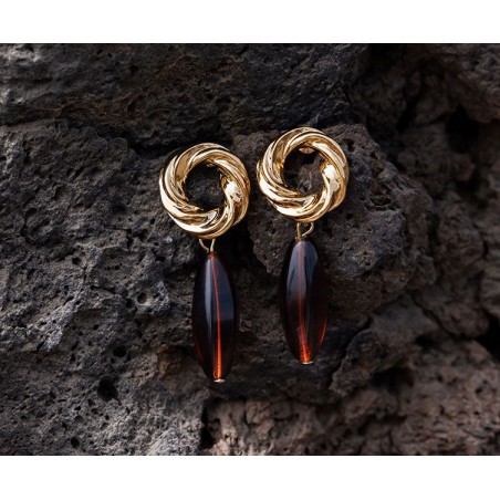 Ces boucles d'oreilles dorées à l'or fin 24 carats allient avec finesse l'élégance rétro et la modernité. La partie supérieure se compose d'un rond torsadé. En dessous, une perle en cristal de verre vintage, en forme d'amande allongée, pend délicatement, ajoutant une note de chaleur avec son brun chaud et intemporel.