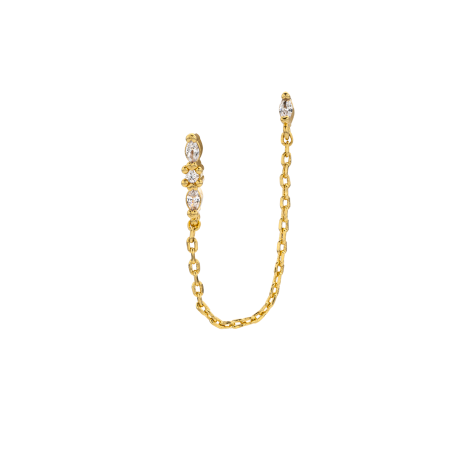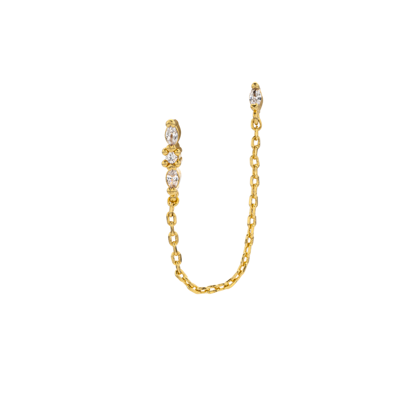 À porter seule et pensée pour deux trous d’oreilles, elle relie une délicate chaînette à trois petits strass étincelants. L’effet est simple, élégant, tout en légèreté, avec juste ce qu’il faut de brillance pour faire la différence.