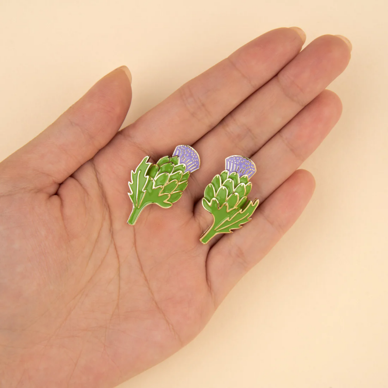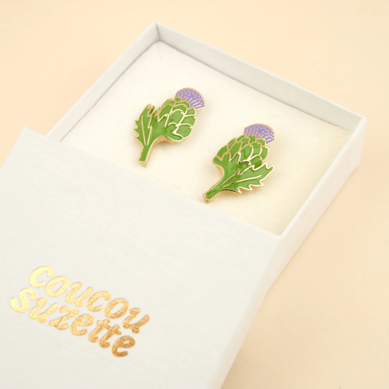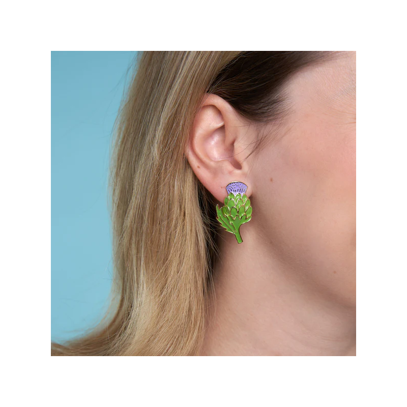 Spécial dédicace à la plus belle des fleurs du potager, nous avons nommé la fleur d’artichaut ! Elle nous z’envoute par sa couleur violette sortie d’un film et son incroyable parfum de miel. Il fallait bien une paire de boucles d’oreilles pour la célébrer, façon bijou vintage déniché en brocante.