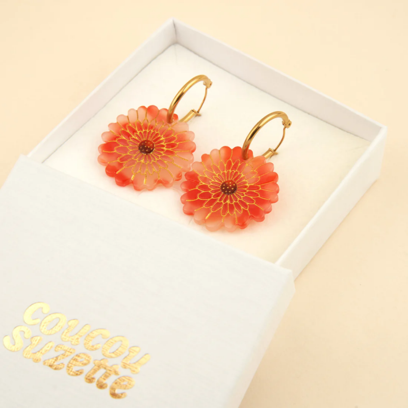 Pour faire fleurir nos oreilles toute l’année, on opte pour cette paire de majestueux dahlias ! Deux grandes fleurs aux innombrables pétales suspendus à des anneaux plaqués or. Un vrai bijou fleuri qui match à merveille avec une coiffure haute, pourquoi pas maintenue par la pince à cheveux assortie.