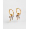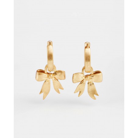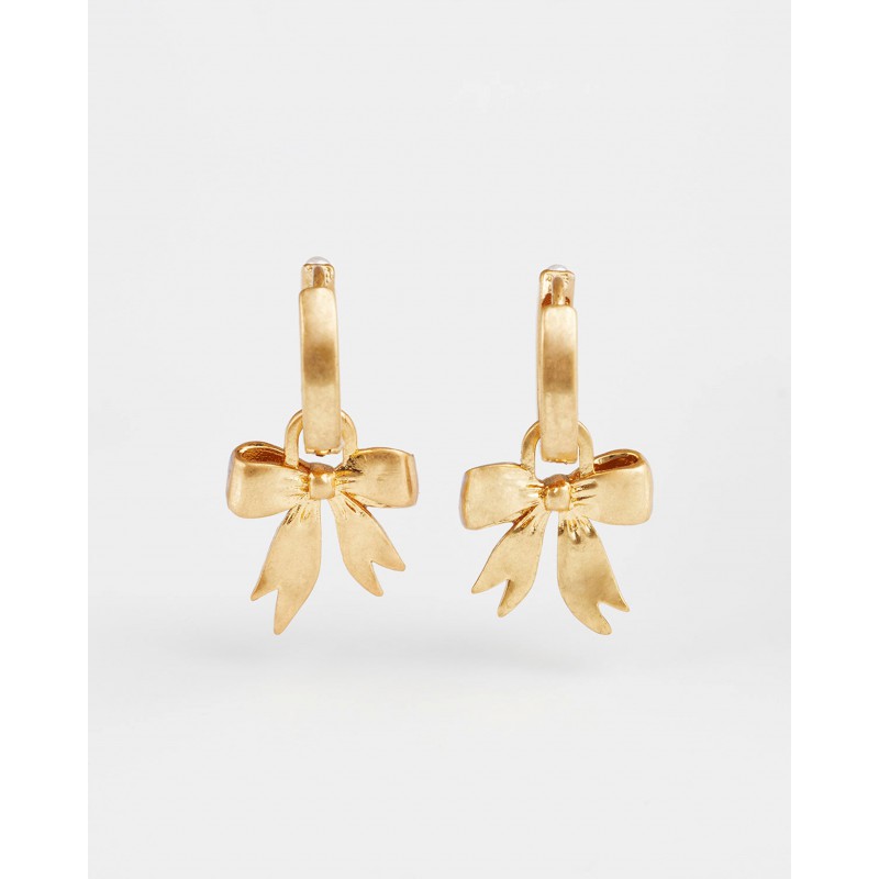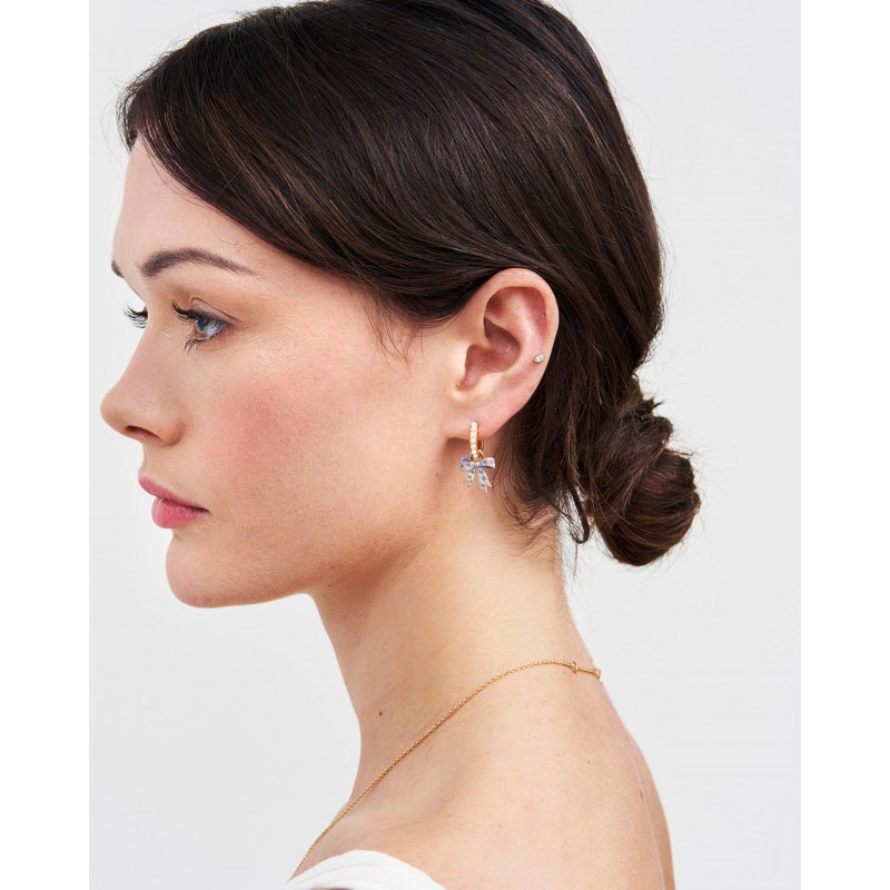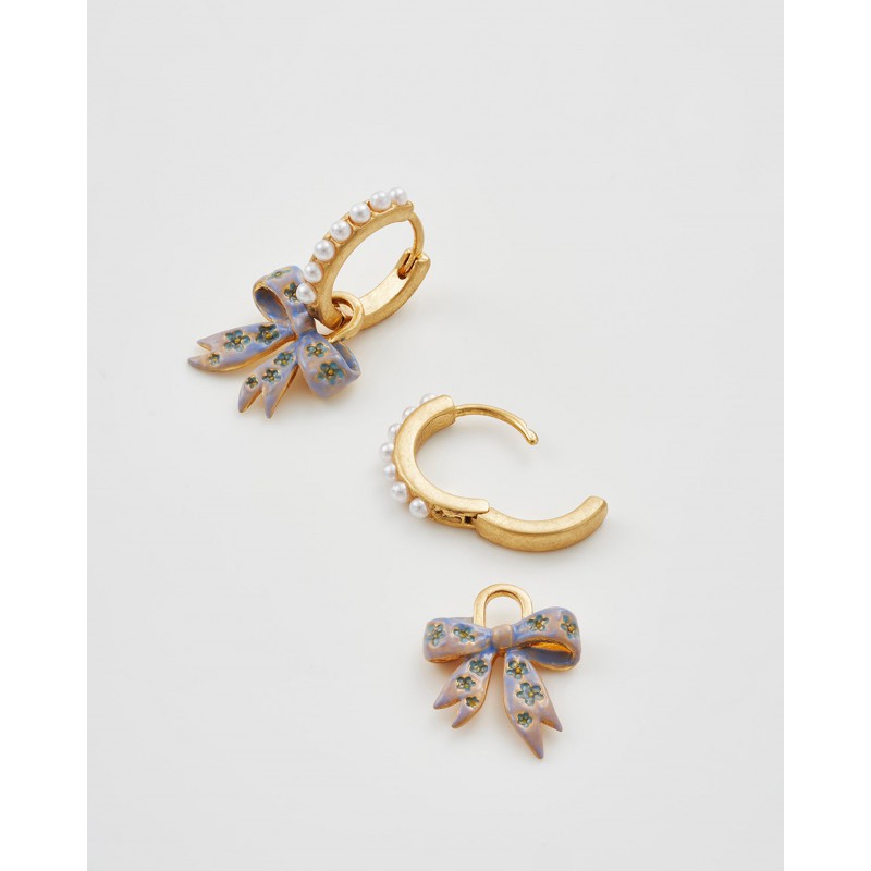 Les boucles d'oreilles Bow Pearl Huggie célèbrent une élégance intemporelle avec une touche ludique. Chaque créole plaquée or est ornée d'un nœud délicatement peint à la main et agrémenté d'une petite perle d'imitation, offrant un équilibre parfait entre charme et sophistication. Grâce à leurs breloques amovibles, elles peuvent se porter de deux façons : avec ou sans le nœud, pour une polyvalence optimale.