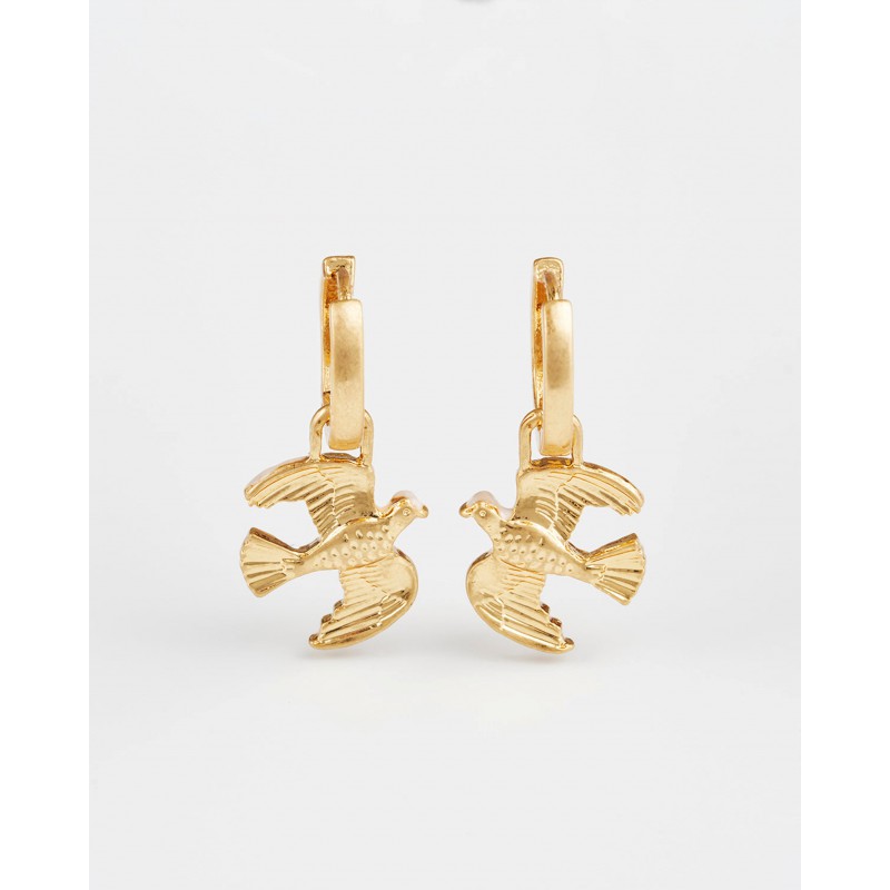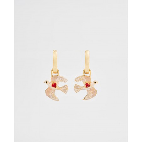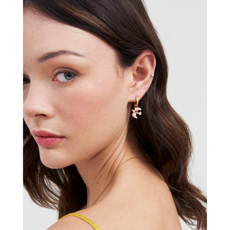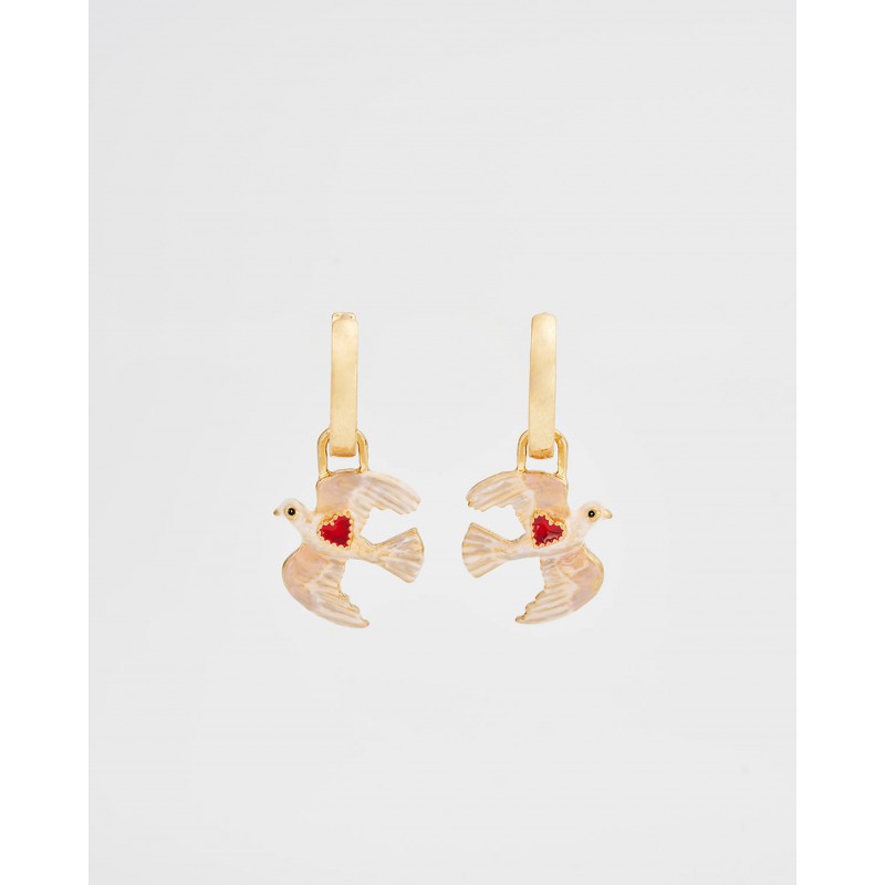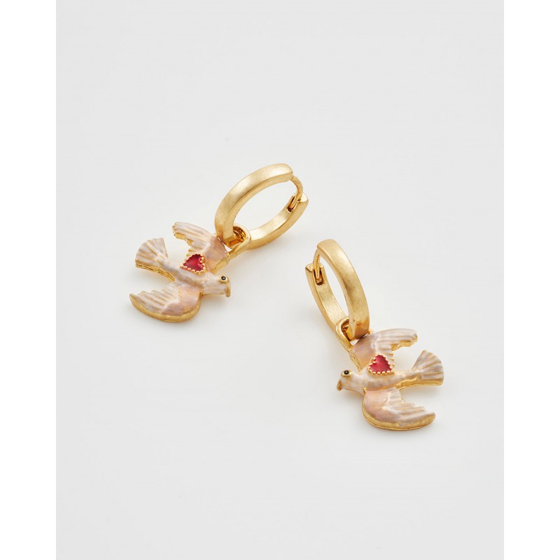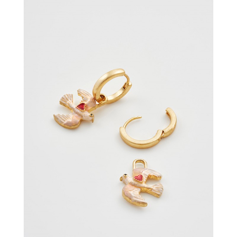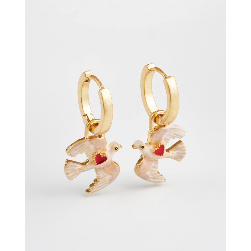 Les boucles d'oreilles Heart Dove Huggie symbolisent l'amour et la paix à travers la grâce de colombes peintes à la main en plein vol. Chaque colombe porte un délicat cœur en émail rouge, incarnant l'espoir et la tendresse. Confectionnées avec une finition plaquée or 22 carats vieilli, ces créoles ajoutent une touche de sens et de charme à votre collection de bijoux, un parfait équilibre entre émotion et élégance.