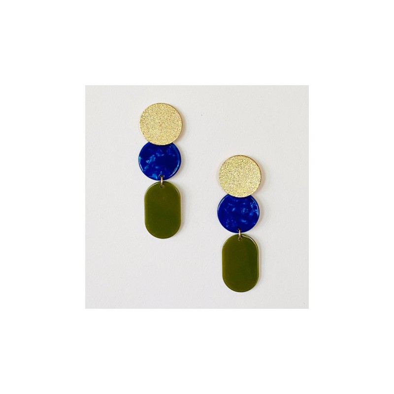 Boucles d’oreilles Océane géométriques en or fin et acétate vert et bleu, mêlant brillance intemporelle et design contemporain. Leur finition dorée sublime chaque tenue avec une touche de sophistication discrète.