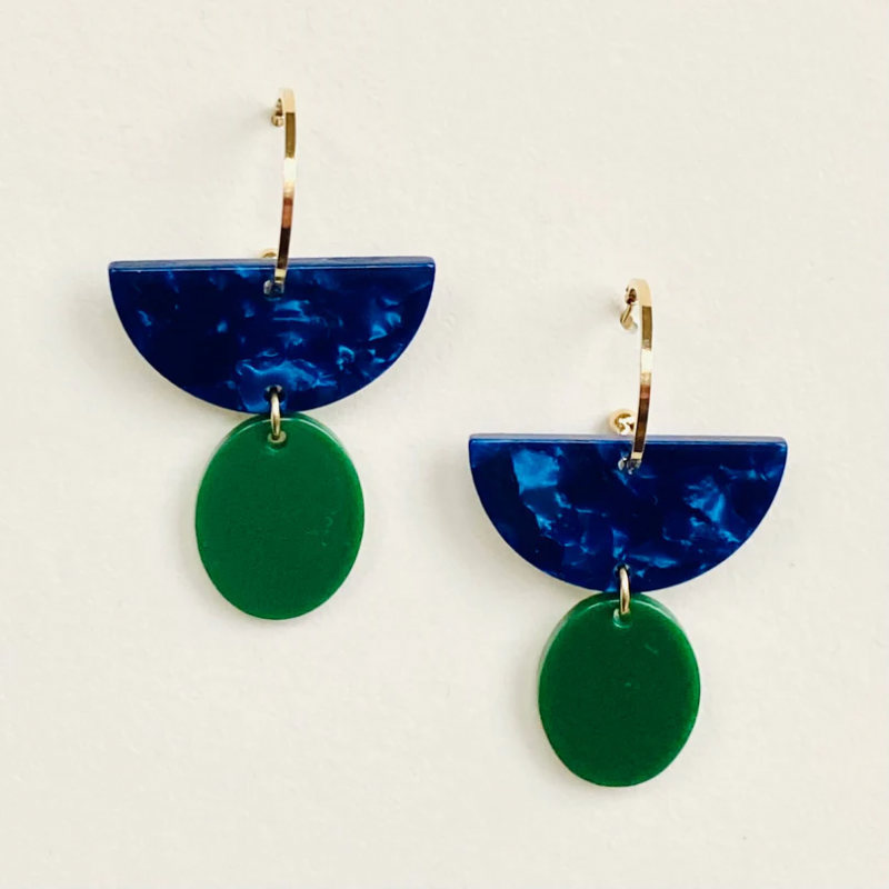 Boucles d’oreilles Aline géométriques en or fin et acétate vert et bleu, mêlant brillance intemporelle et design contemporain. Leur finition dorée sublime chaque tenue avec une touche de sophistication discrète.