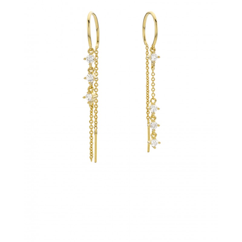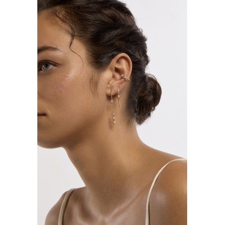 Les boucles d’oreilles asymétriques RIALTO de MYA—BAY rendent hommage au mythique pont de Venise. Inspirées par son élégance architecturale, elles mêlent une ligne délicate à une fine chaîne pendante ornée de zircons blancs, pour un jeu de mouvement et de lumière ultra raffiné. Une asymétrie chic et subtile, parfaite pour illuminer l’oreille avec sophistication