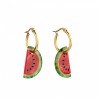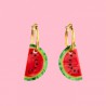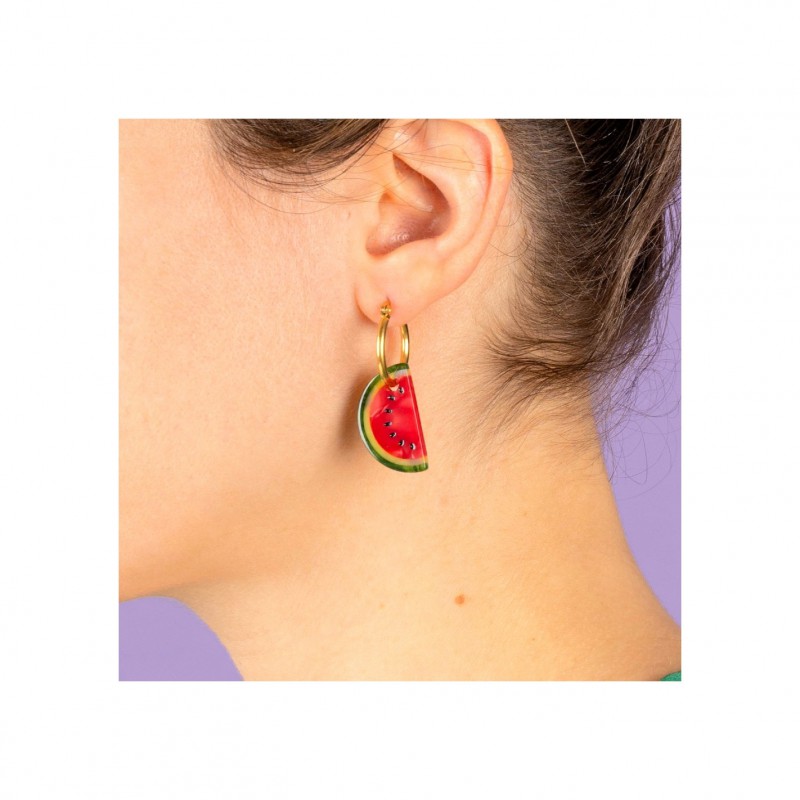 Des boucles d’oreilles intemporelles plaquées or façon créoles, agrémentées de jolies parts de pastèques nacrées. On craque pour ce bijou léger à porter et aux couleurs éclatantes, dans les tons rose vibrant et vert intense, juicy à souhait, qui viendra pimper toutes nos tenues !