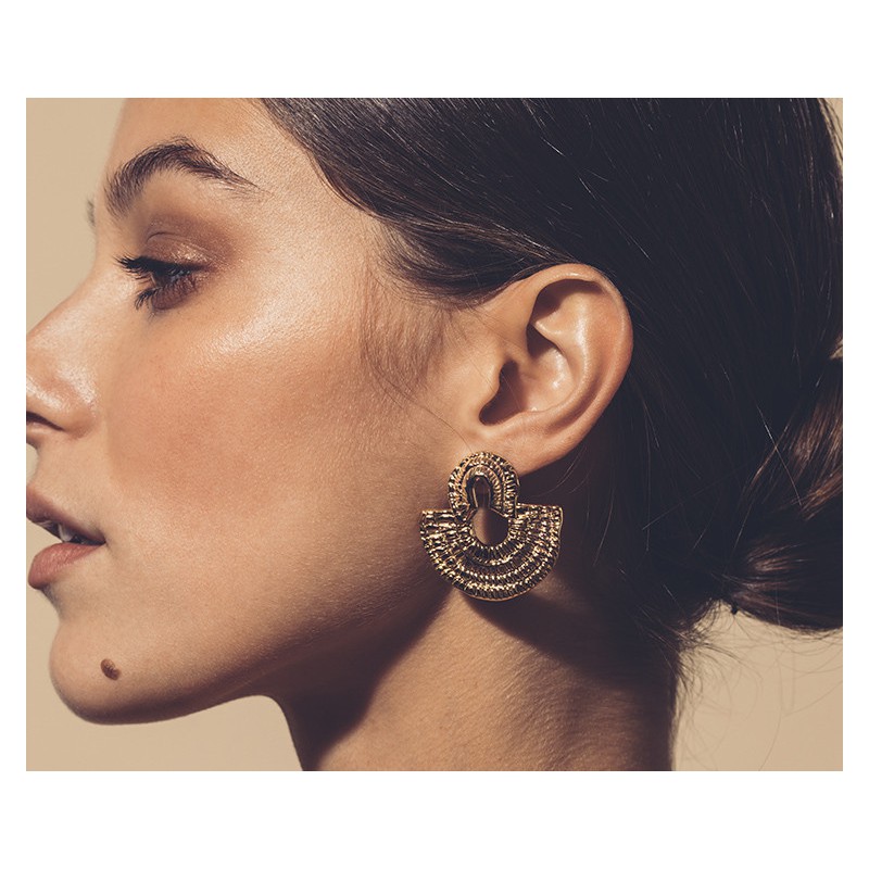 Grandes boucles d'oreilles irrégulières dorées, composées de deux demi lunes gravées.
