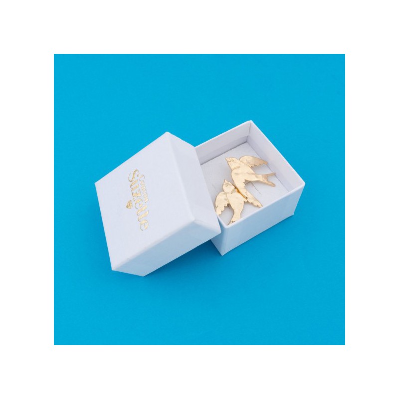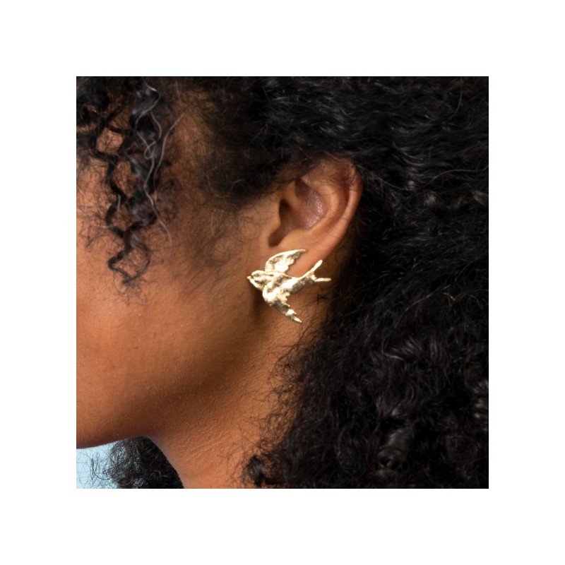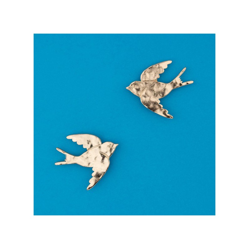 Voilà des petites beautés qui changent un peu de ce qu’on connaît chez Coucou Suzette ! On laisse un instant les jolis anneaux de côté pour cette magnifique paire de boucles d’oreille Hirondelle plaquées or effet martelé. Autant vous dire qu’on est fan de ce bijou dans l’équipe. On l’adore porté avec une coiffure haute (pourquoi pas grâce à la pince ou au pic à chignon assortis ?) pour bien mettre en valeur ces beaux oiseaux dorés !