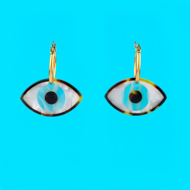 L'œil bleu, l’emblème adoré de Coucou Suzette, se décline à l’infini ! Il revient ici sous forme de boucles d’oreilles rétro, suspendu à un petit anneau plaqué or, avec ses bordures écailles de tortue et son iris bleu turquoise irisé. À porter en journée ou pour les soirs de fête, comme un petit gri-gri qui vous portera bonheur partout où vous irez.