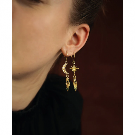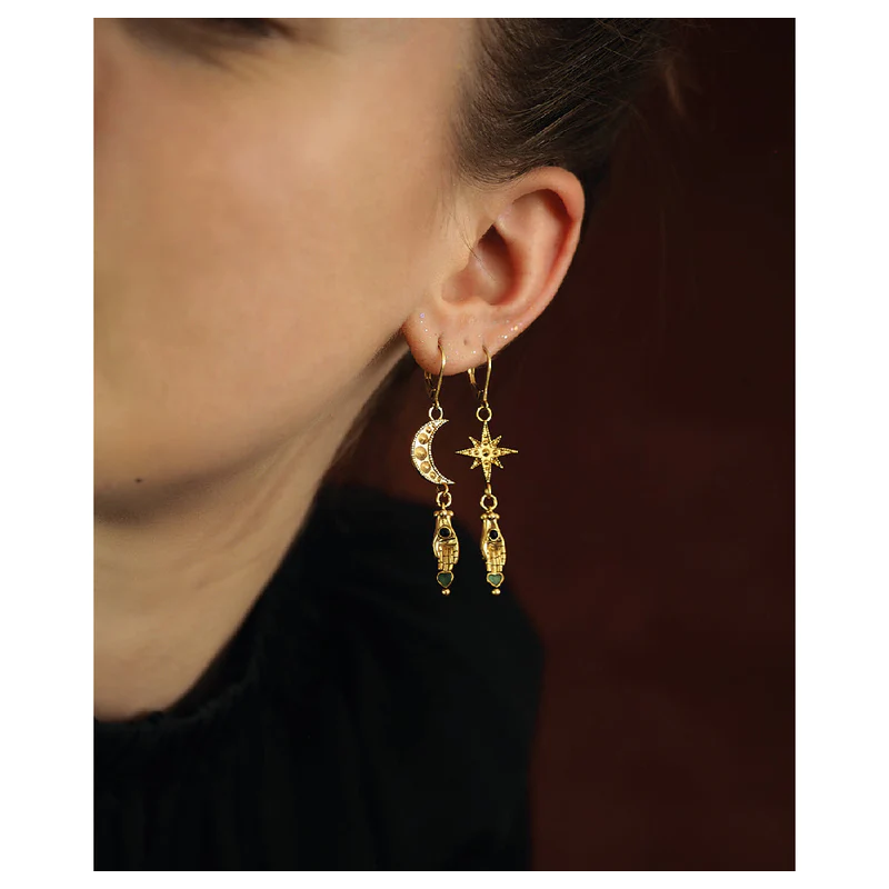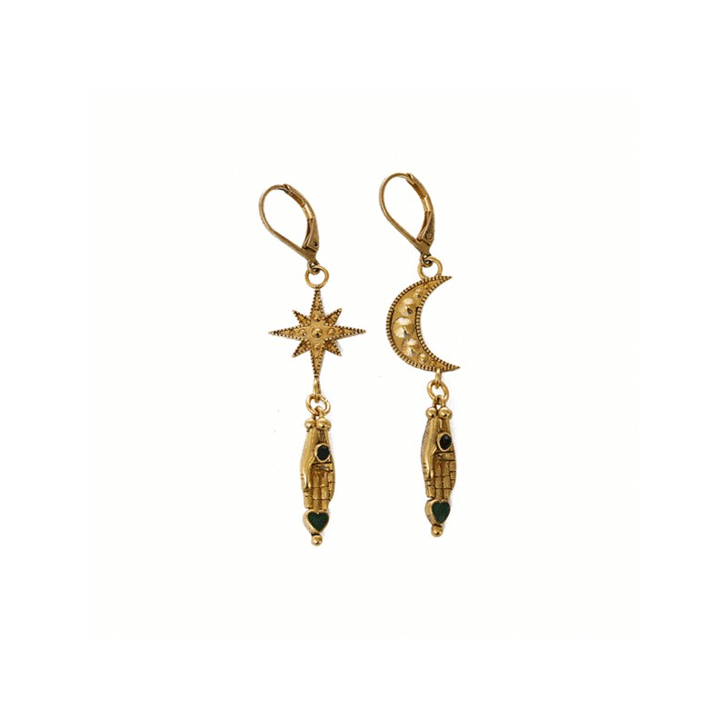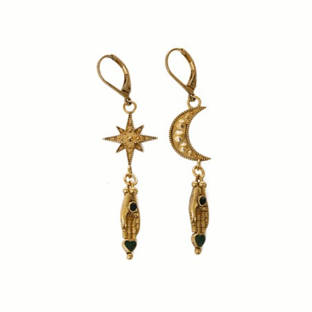 Boucles d’oreille en laiton bain d’or et pampilles lune et étoile avec mains coeurs émaillées.
