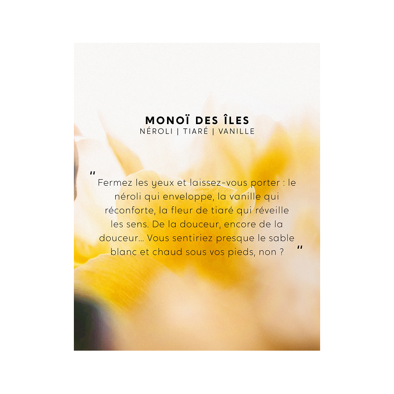 Il faut fermer les yeux et se laisser porter : le néroli qui enveloppe, la vanille qui réconforte, la fleur de tiaré qui réveille les sens. De la douceur, encore de la douceur... Vous sentiriez presque le sable blanc et chaud sous vos pieds, non ?