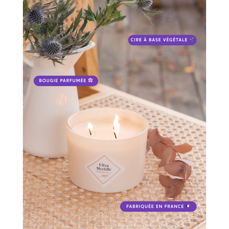 Les grandes bougies 3 mèches sont parfaites pour apporter une ambiance olfactive chaleureuse. Idéales pour les amoureux des bougies ou pour faire un cadeau attentionné. Craquez sur une combinaison joyeuse et espiègle, comme un bonbon à la myrtille aux accents de violette.