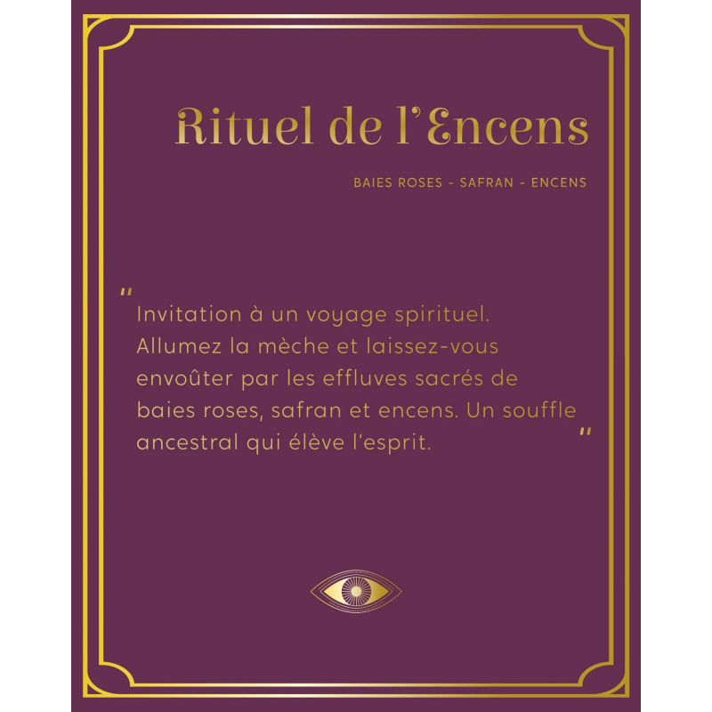 Invitation à un voyage spirituel. Allumez la mèche et laissez-vous envoûter par les effluves sacrés de baies roses, safran et encens. Un souffle ancestral qui élève l’esprit.