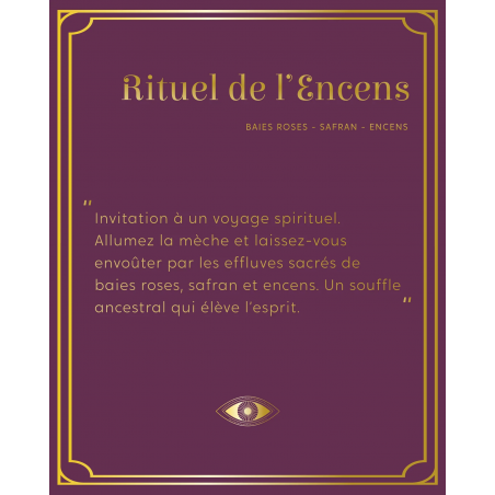 Allumez la mèche et laissez-vous envoûter par les effluves sacrés de baies roses, de safran et d’encens, un souffle ancestral qui élève l’esprit. Au fil de la combustion, la cire fondue révèle un bracelet orné d’un œil de protection : portez-le comme un talisman inspiré des traditions anciennes.