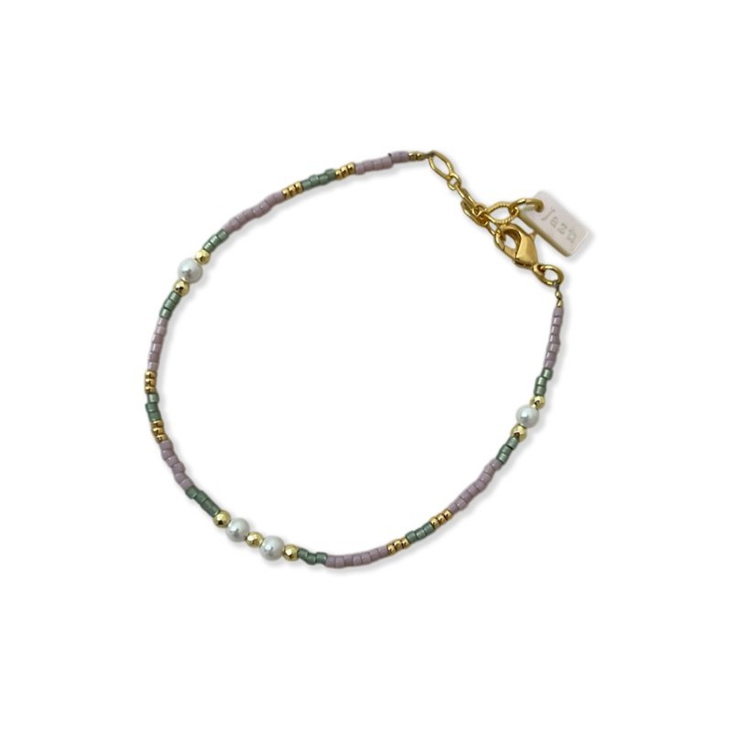 Bracelet en petites perles de verre serties de pierres semi-précieuses, fermoir et chaînette d'extension plaqués or, fait main. ± 15-18 cm