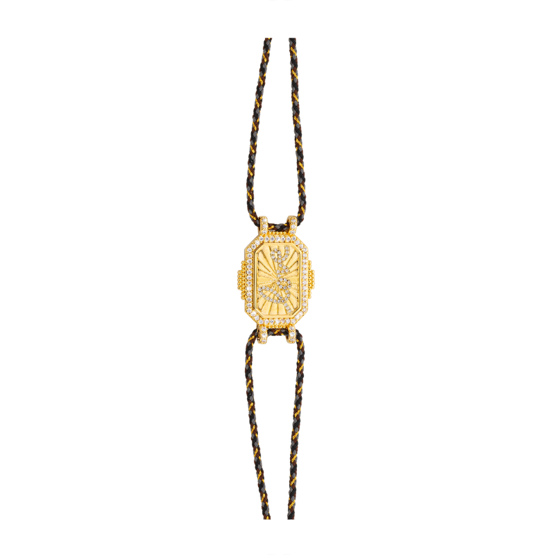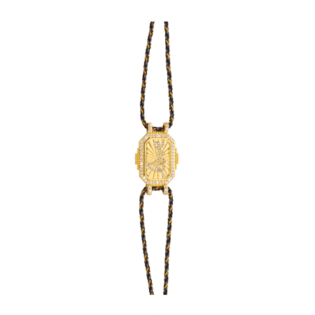 Son inscription "LOVE" s’invite au cœur d’un médaillon entièrement doré, pour un look monochrome plein de lumière. Monté sur un cordon noir tissé de fils dorés, il incarne l’équilibre parfait entre finesse, douceur et statement assumé.