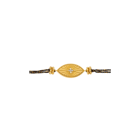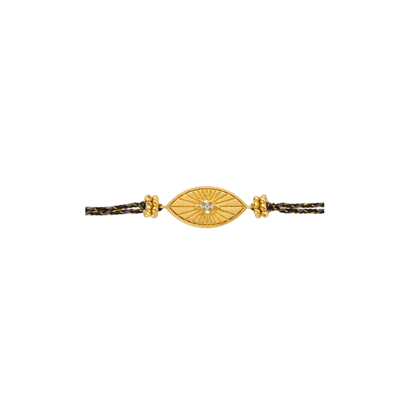 Le bracelet DIWALI IRIS de MYA—BAY, c’est une déclaration de style et de force symbolique. Monté sur un cordon noir tissé de fils dorés, il évoque à la fois la forme de l’œil protecteur et la ceinture du boxeur, clin d’œil appuyé à notre collection ROUND ONE.